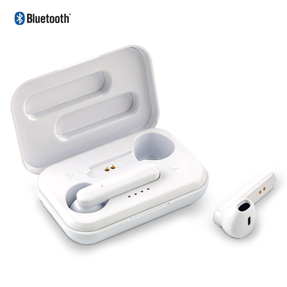 Audifonos inalambricos plasticos Bluetooth. Con estuche imantado portatil de recarga que muestra el nivel de carga. Capacidad de la bateria: 30mAh 300mAh. Tiempo de trabajo: 2,5 horas. Version de Bluetooth: V5.0. Rango de transmision: 2,4 GHz-2,48 GHz. Linea de transmision: 10 M. Funciona como manos libres. Empaque caja individual. Medidas: 6 cm x 4 cm x 2 cm Marca: 4 cm Tampografia