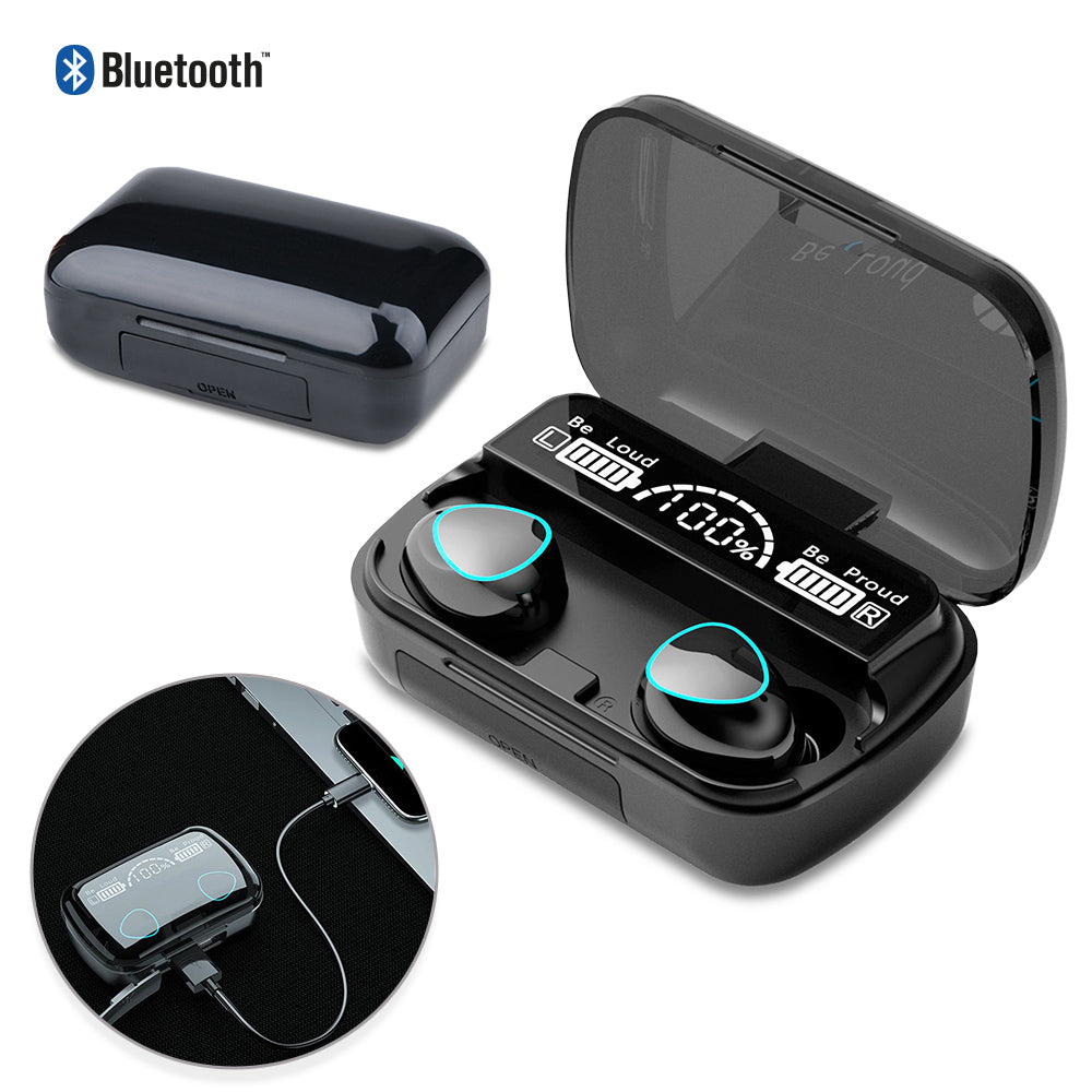 Audífonos plásticos Bluetooth. Con estuche portátil y display LCD de recarga de 2.000mAh que muestra el nivel de carga. Voltaje de funcionamiento: DC5V, Resistente a salpicaduras IPX7, Reducción de ruido CVC8.0. Capacidad de la batería: 50mAh 2.000mAh. Tiempo de trabajo: Carcasa: hasta 30-40 recargas de los audífonos cada vez estimado, Audífonos 3 horas. Versión de Bluetooth: V5.1EDR. Línea de transmisión:10 M. Funciona como manos libres. Empaque caja individual. Medidas: 8 cm x 5 cm x 3 cm Marca: 4 cm Tampografía en el estuche Ficha Técnica