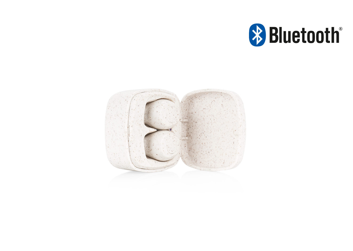 Audífonos Bluetooth 5.1 fabricados con paja de trigo, un material sostenible y amigable con el medio ambiente. Incluyen estuche de carga con batería de polímero de litio de 200 mAh. Ofrecen hasta 4 horas de uso continuo y función de manos libres. Voltaje de carga: 5 V. Diseño compacto y ecológico, ideal para el día a día.. Area impresion: Tampo: 3 cm x 3 cm . Medidas Largo: 4.3 . Medidas Ancho: 4.5 . Medidas Alto: 2.7