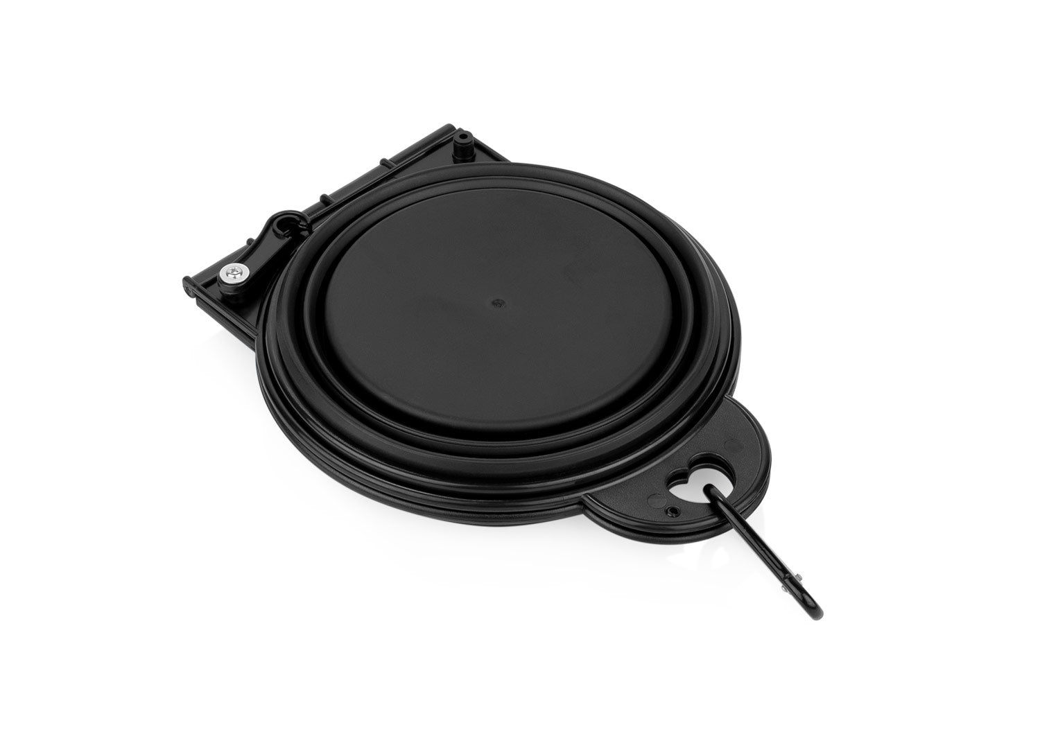 Bebedero de silicona plegable. Gracias a sus 2 compartimentos, puede ser usado para bebida y alimento simultáneamente. Es portátil e incluye gancho carabinero para transportarlo fácilmente. Además, cuenta con 2 pequeños ganchos plásticos de seguridad para evitar derrames. Capacidad: 400 ml 13 Oz.. Area impresion: Tampo: 5 cm x 5 mm . Medidas Ancho: 35.8 . Medidas Alto: 5.3
