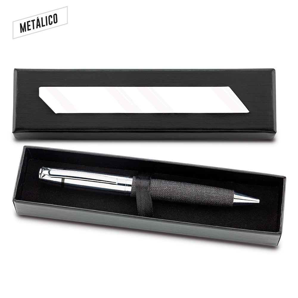 Bolígrafo metálico en estuche de cartón. Mecanismo Twist. Empaque caja individual. Medidas: 14 cm . Marca: 2 cm Láser Ficha Técnica