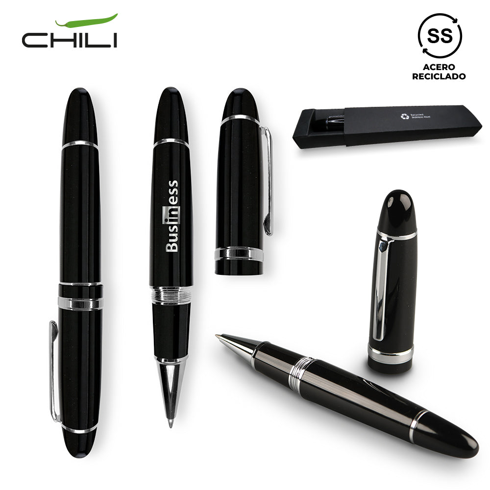Bolígrafo roller en acero inoxidable reciclado, clip metálico y tapa rosca incluye mina adicional. Empaque caja individual. Medidas: 14.5 cm. Caja: 17.6 cm X 4.6 cm X 2.2 cm. . Marca: 4 cm x 0.8 cm Tampografía - Lasér acabado espejo. Ficha Técnica Venta mínima y en múltiplos de caja de 50 unidades por color.