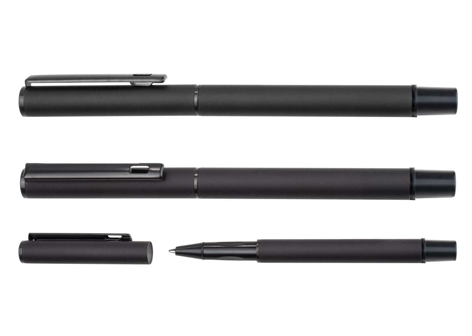 Bolígrafo con cuerpo de aluminio de color engomado con tapa, clip negro y adornos. BolígrafoEsfero. Area impresion: Láser: (3 X 0,7). . Medidas Alto: 14