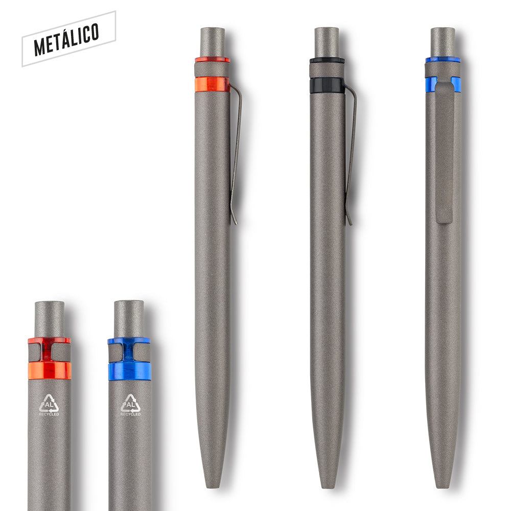 Bolígrafo elaborado en aluminio post-consumo. Clip metálico. Mecanismo push. Medidas: 14 cm . Marca: 3.5 cm Láser Venta mínima y en múltiplos de caja de 50 unidades por color.  Ficha Técnica