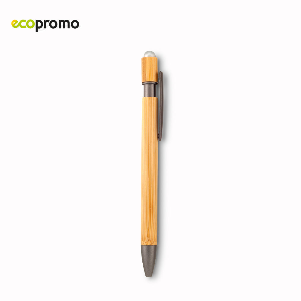 Bolígrafo en bambú con stylus. Mecanismo push y clip metálico. Medidas: 14.5 cm.. Marca: 4 cm Láser. Venta mínima y en múltiplos de caja de 50 unidades.  Ficha Técnica