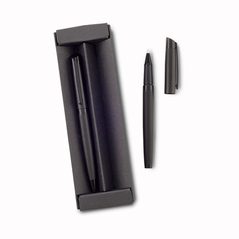 Set de bolígrafo con mecanismo twist y roller. Estuche individual en cartón. Medidas: Estuche: 17.3 cm x 5.3 cm x 2.1 cm Bolígrafos: 13.5 cm. Marca: Estuche: 4.5 cm Tampografía. Bolígrafos: 3 cm Láser en el barril. Bolígrafos: 3 cm Láser barril superior. Ficha Técnica