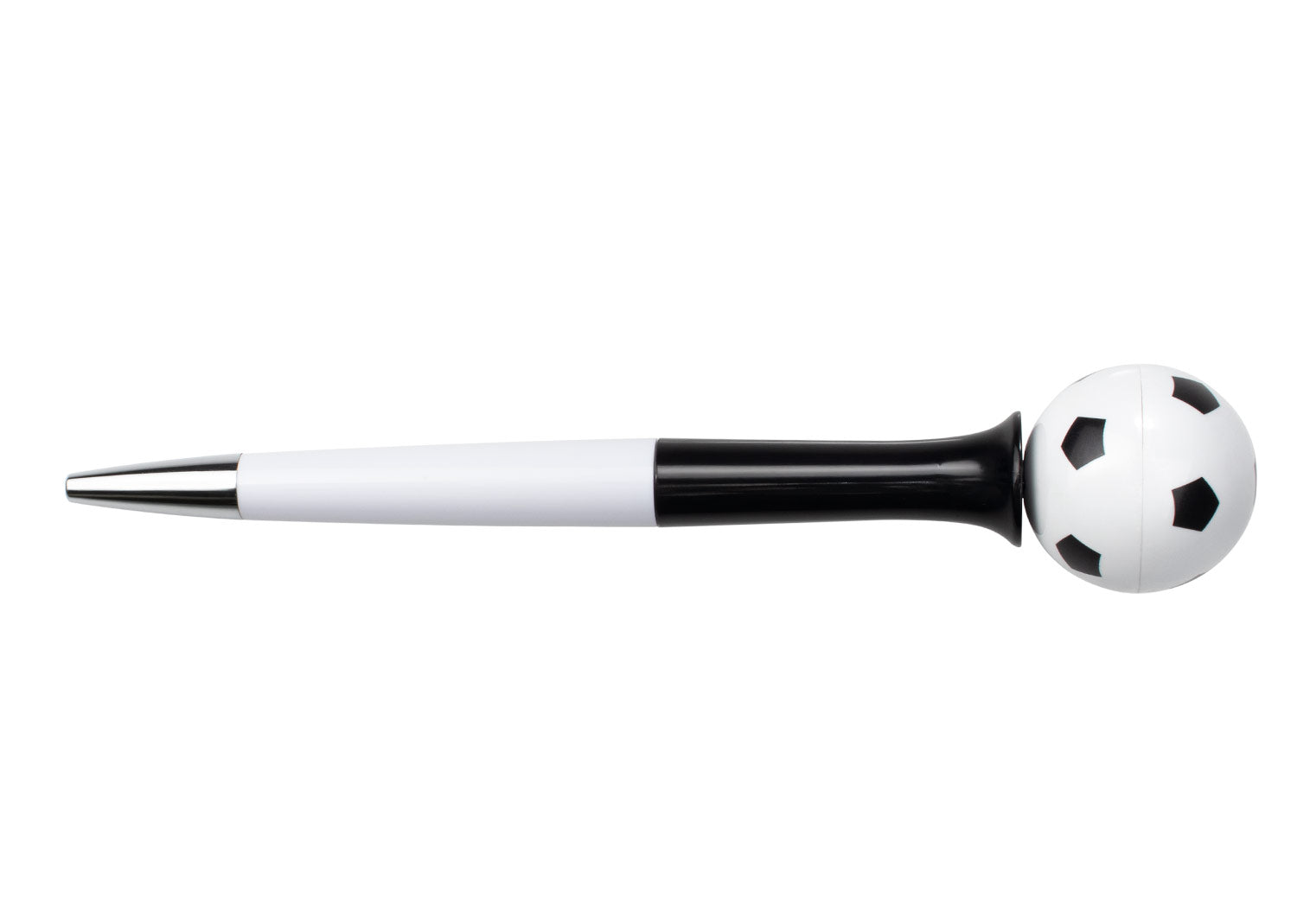 Bolígrafo de acción giratoria con barril de color sólido y punta cromada, ideal para los amantes del fútbol. Su diseño incluye una esfera decorativa con impresión de balón en la parte superior, que gira suavemente para añadir un toque divertido y dinámico mientras escribes.. Area impresion: Tampo: (4,5 X 0,7). . Medidas Alto: 16