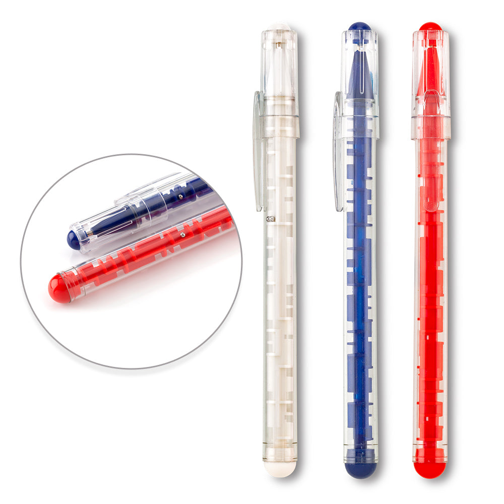 Bolígrafo plástico con tapa y barril con laberinto. Medidas: 14.5 cm Marca: 4 cm Tampografía Venta mínima y en múltiplos de caja de 50 unidades por color.  Ficha Técnica