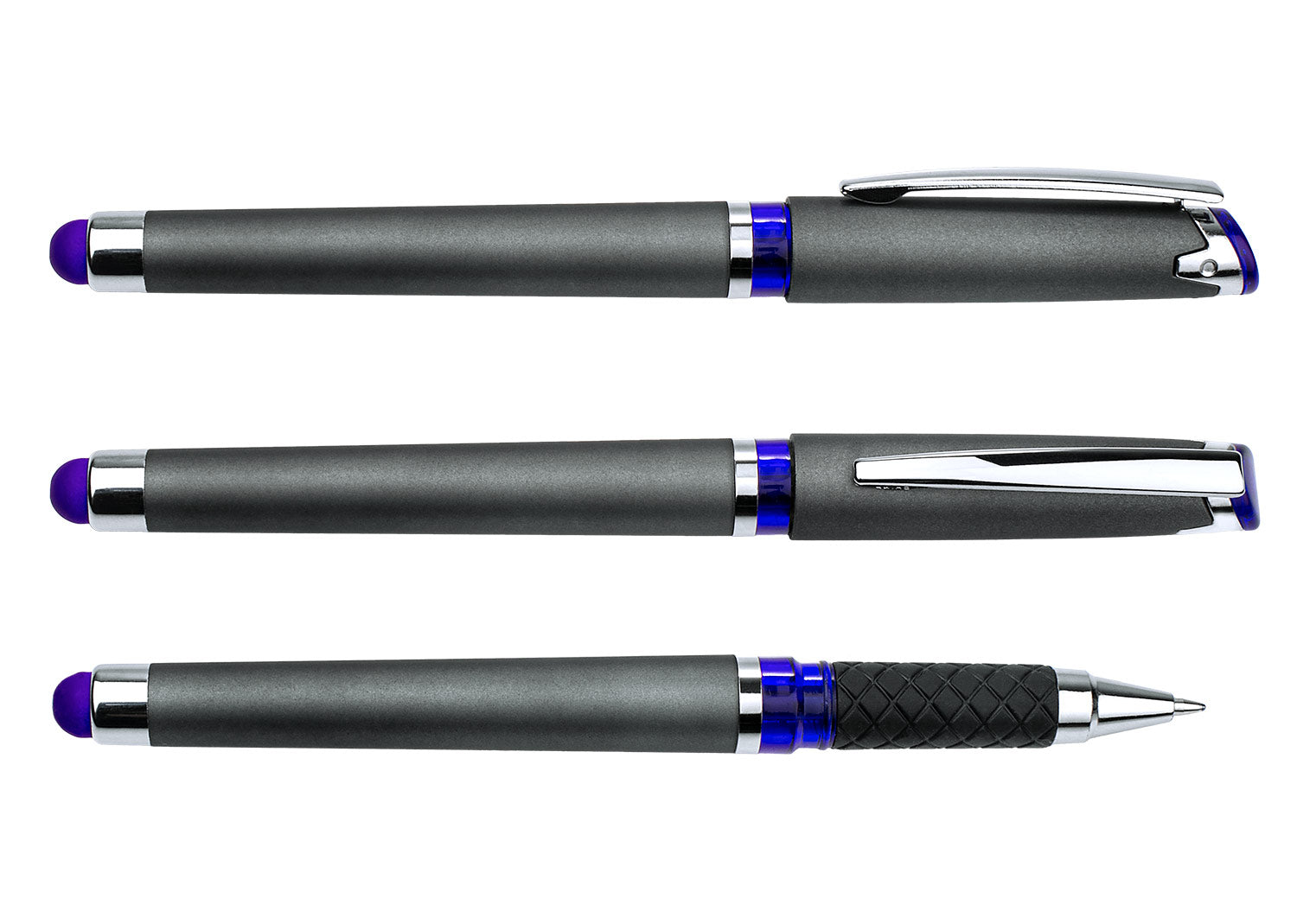 Bolígrafo con tapa y touch para dispositivos con pantallas táctiles, grip de caucho para fácil agarre y mina tipo Gel, clip metálico, al momento de la fabricación utiliza técnica de pintura Water Based BolígrafoEsfero. Area impresion: Tampo: en el barril 5 cmt x 0,7 mm, tapa 3 cmt x 0,7 mm . Medidas Largo: 14.60