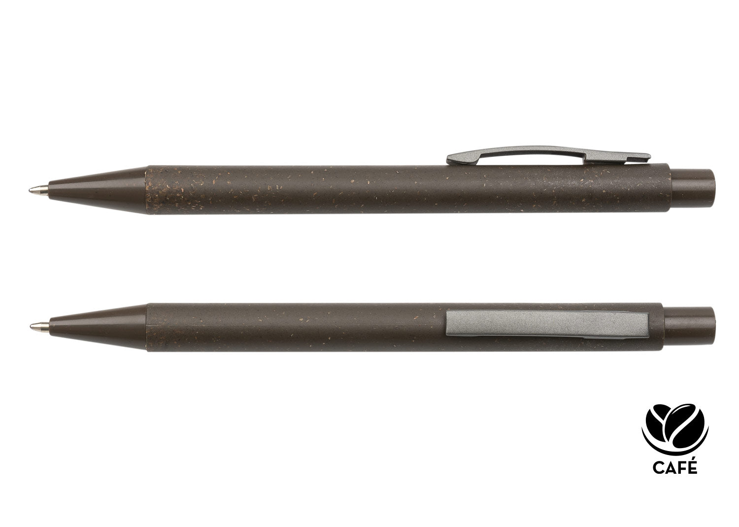 Bolígrafo ecológico elaborado de una mezcla de plástico ABS con fibra de café. Sistema retráctil. BolígrafoEsfero. Area impresion: Tampo: 6 cm x 0,7 cm . Medidas Largo: 13.7