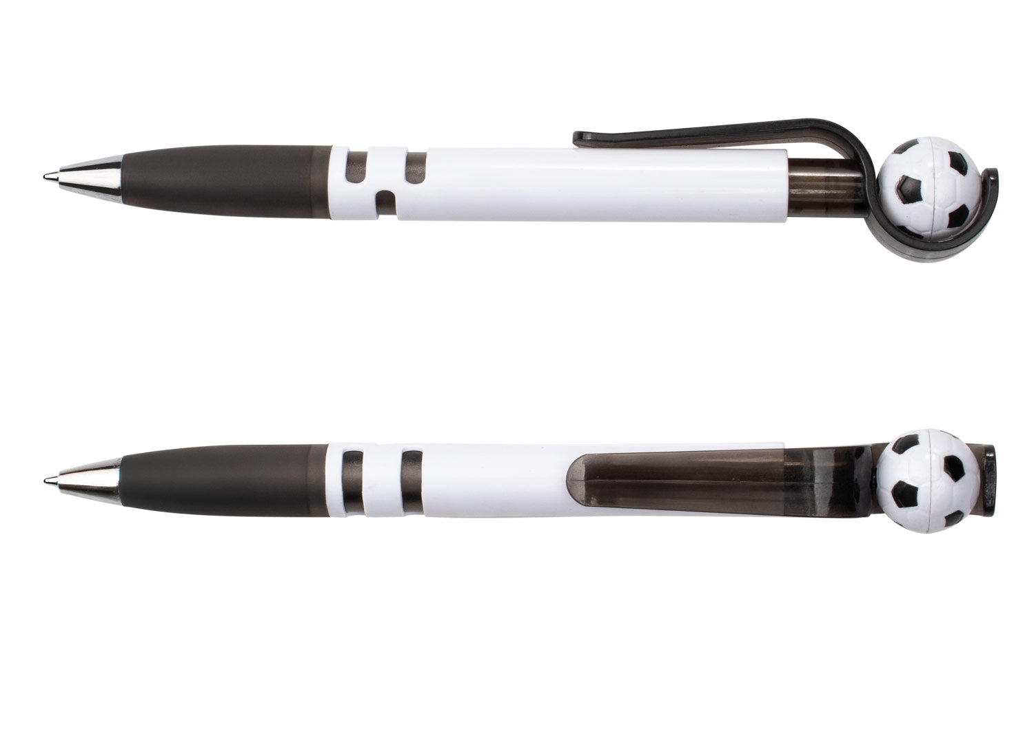 Con barril blanco sólido, clip y empujador traslúcidos que integran un mecanismo giratorio con balón de fútbol. Su empuñadura traslúcida brinda comodidad al escribir, mientras que la punta cromada aporta un toque moderno. El balón gira al impulsarlo, haciendo de este bolígrafo una opción divertida y funcional.. Area impresion: Tampo: (4,5 X 0,7). . Medidas Ancho: 1.4 . Medidas Alto: 14.3