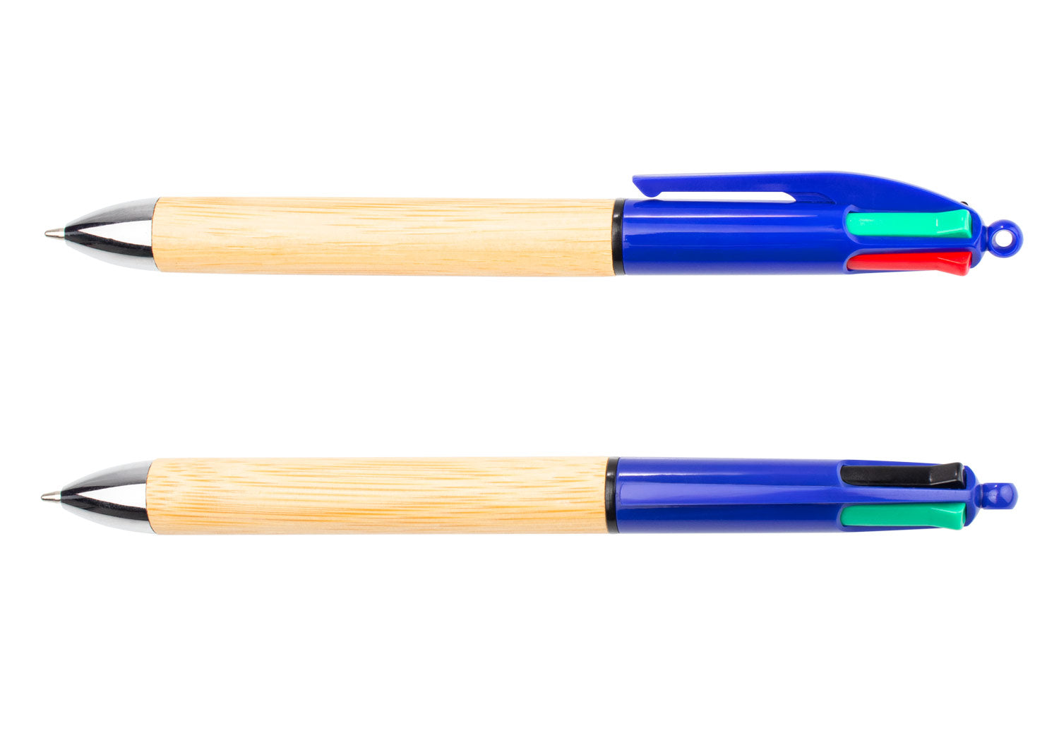 Bolígrafo con cuerpo de bambú, cuerpo superior de color sólido, punta cromada, incluye 4 minas de diferentes colores. BolígrafoEsfero. Area impresion: Tampo: (6 X 0,8). Láser: (3 X 0,7). . Medidas Alto: 15