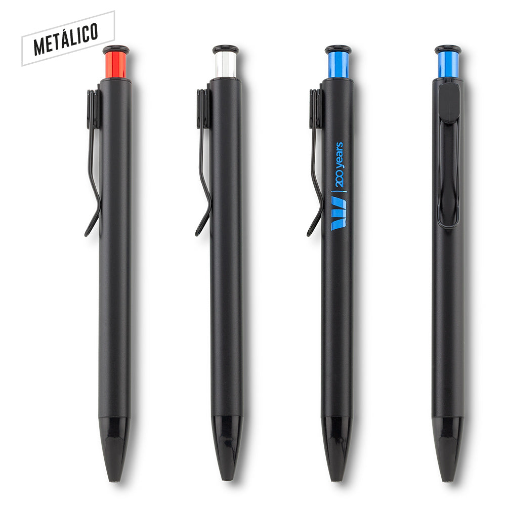 Bolígrafo metálico con partes plásticas. Clip metálico, mecanismo push. Puede ver el logo del mismo color del pulsador al marcar en láser. Medidas: 14 cm Marca: 3.5 cm Láser Venta mínima y en múltiplos de caja de 50 unidades.  Ficha Técnica