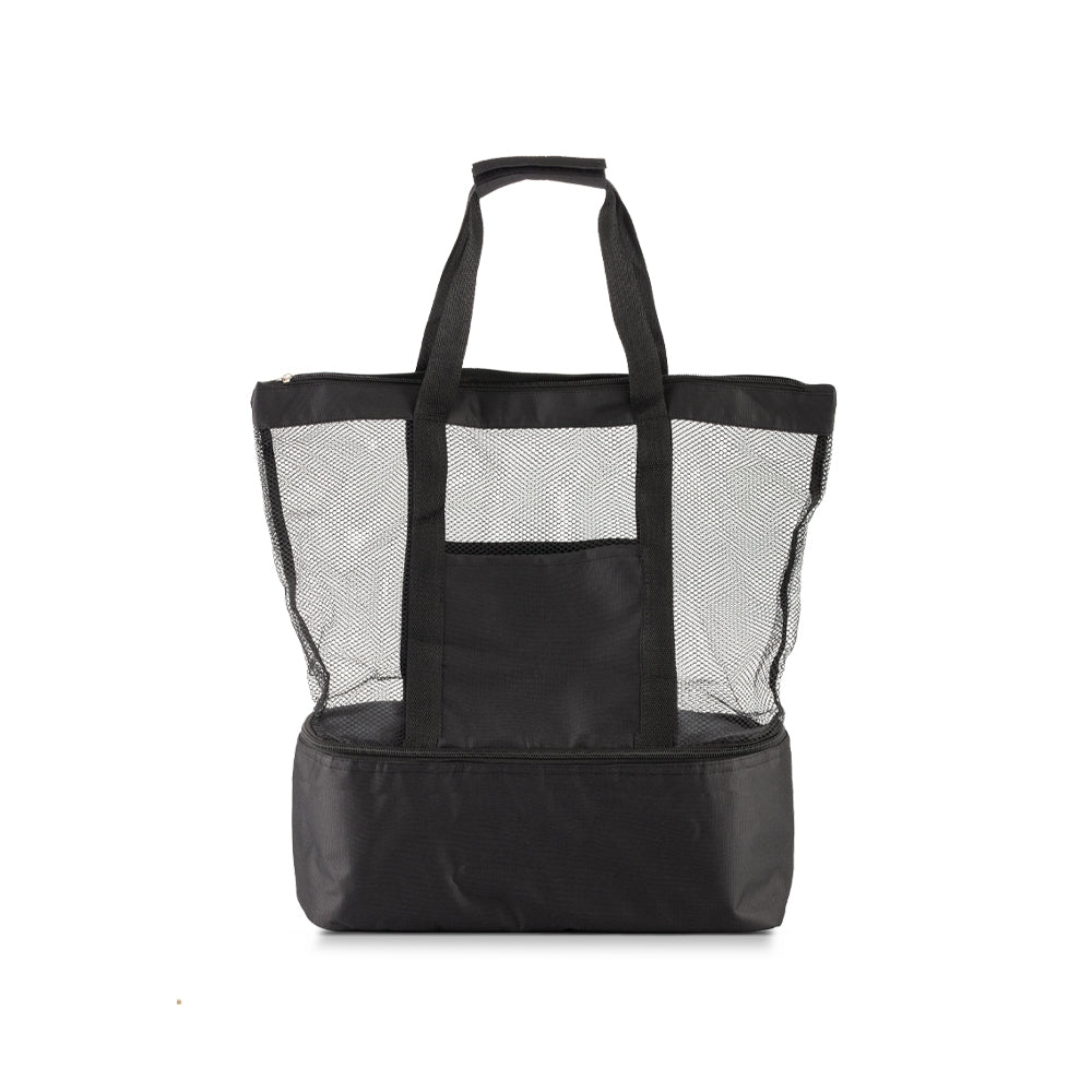 Bolsa nevera en lona poliéster. Un bolsillo principal en malla. Un bolsillo secundario el cual funciona como cooler bag. Medidas: 44 cm x 40 cm x 14 cm. Marca: 10 cm Screen.