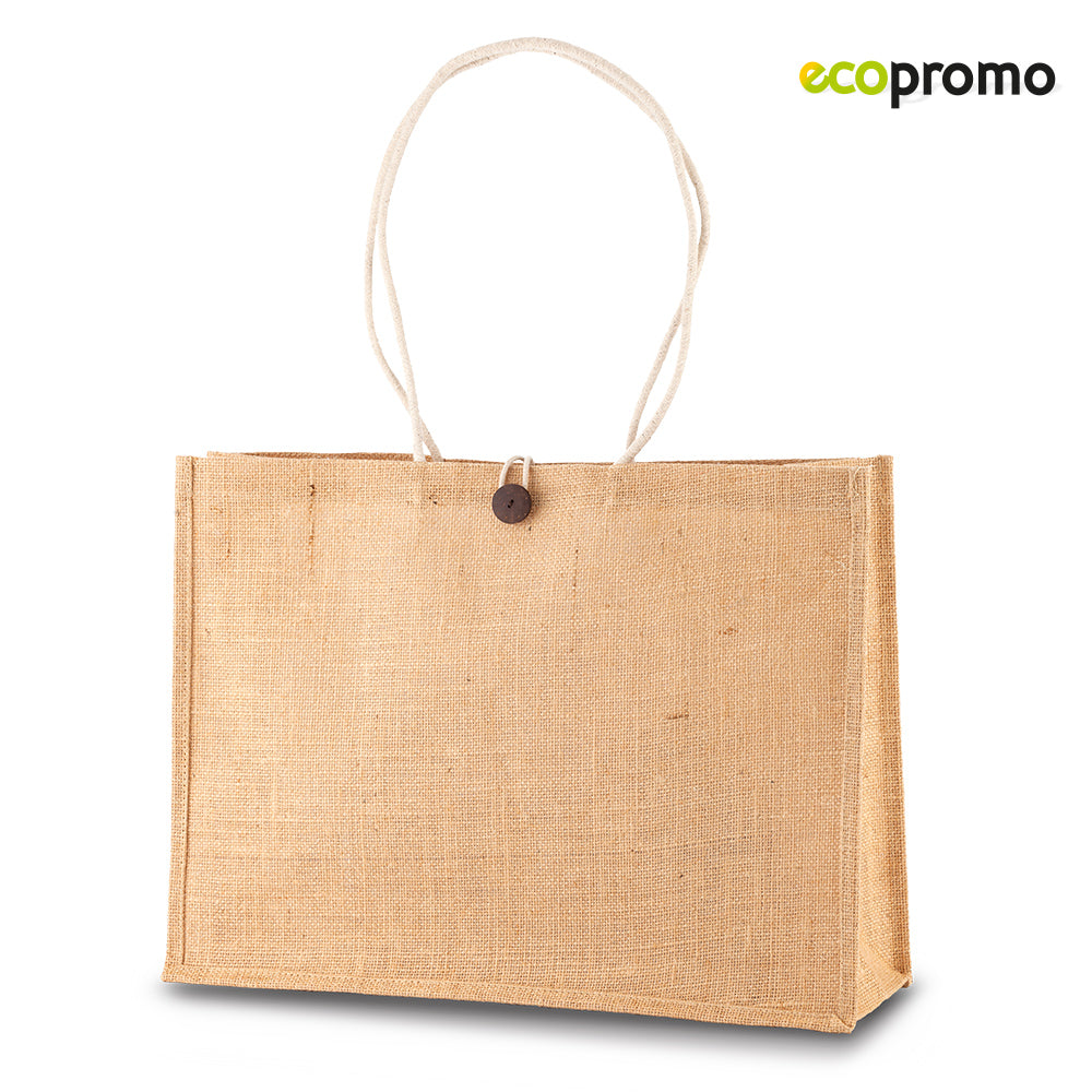 Bolsa en Yute con agarradera de cordón y cierre de botón. Medidas: 46 cm x 34 cm x 14 cm fuelle Marca: 25 cm Screen