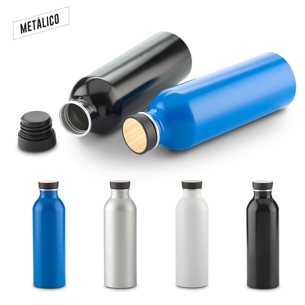 Botilito en aluminio con tapa en plástico y bambú. Empaque caja individual.  Medidas: 21 cm x 6,5 cm diámetro Marca: 4 cm Tampografía Láser Líquido Oxidante en Silver Ficha Técnica