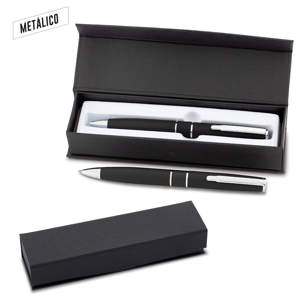 Metálico con acabado caucho, clip metálico. Empaque caja individual. Medidas: Estuche: 17.5 cm x 4.7 x 3 cm. Bolígrafo: 14 cm Marca: Estuche: 4.5 cm Tampografía - Bolígrafo: 4 cm Láser Venta mínima y en múltiplos de caja de 50 unidades. Ficha Técnica