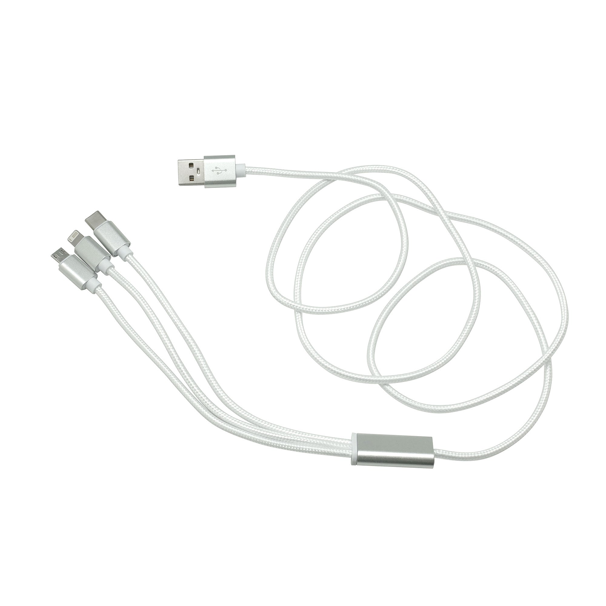 Aluminio y Nylon. 120 cm. Cable con entrada USB y diferentes adaptadores: Iphone, Type C y Android. Viene dentro de una bolsa plásticas con cierre ziploc. Carga rápida de 2,1 a.. Medidas Ancho: 29.0 . Medidas Alto: 36.0 . Medidas Profundidad: 30.0