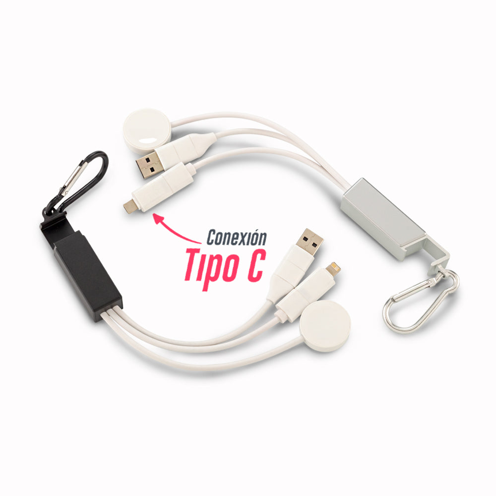Cable multicargador. Con puertos Tipo USB y Tipo C. Cables con conectores lightning, Tipo C y USB. Cargador para Smart Watch. Con soporte para celular y gancho carabinero. Medida: 33 cm x 1.6 cm. Marca:3.5 cm Tampografía.