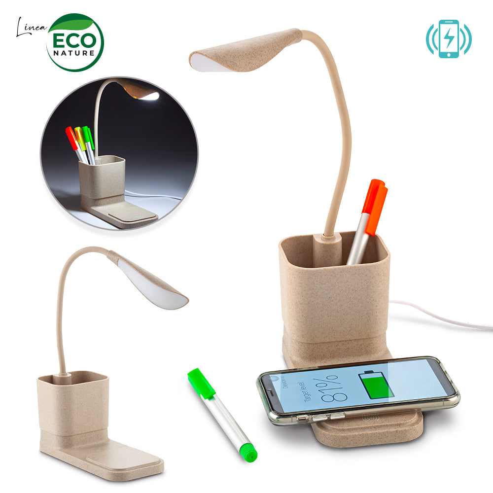 Lámpara multifunción elaborada en plástico mezclado con fibra de trigo. Base antideslizante, cargador inalámbrico 10W y lámpara de 12 LED, con intensidad de luz regulable. Compatible con dispositivos móviles de carga inalámbrica, debe usarse con el cable cargador micro USB provisto con el dispositivo. Empaque caja individual. Medidas: 18 cm x 8 cm x 9.5 cm Marca: 4 cm Tampografía Lo que debe saber: Este artículo transmite la energía y NO acumula carga para llevar, funciona siempre y cuando esté conectado. Sirve únicamente en dispositivos móviles que vengan desde fábrica con la funcionalidad de carga inalámbrica. Nota Importante La tecnología de carga inalámbrica funciona con los dispositivos móviles compatibles con esta funcionalidad; se recomienda buscar en las especificaciones de su dispositivo móvil y en el manual de uso que puede descargarse para cada marca y modelo, si su dispositivo es compatible. Se recomienda retirar el forro protector de su móvil y cualquier otro elemento que genere interferencia cuando se coloque a cargar.