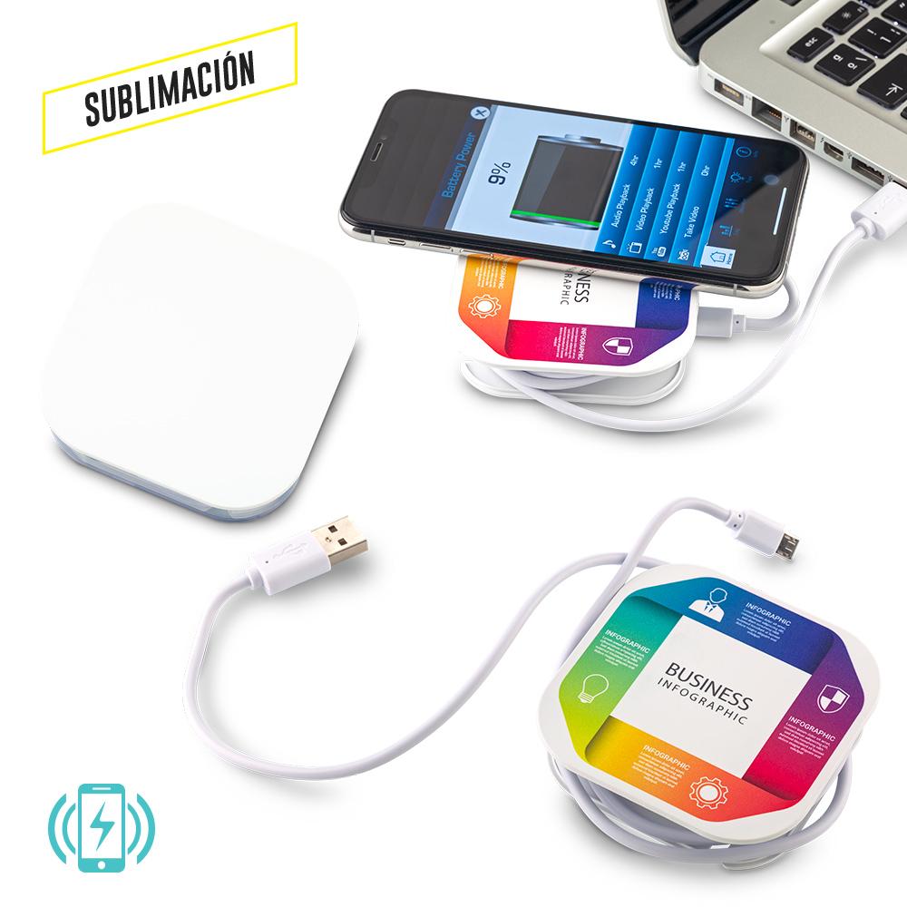Cargador inalámbrico plástico de 5W. Con organizador de cables. Entrada: DC 5V2A Salida: DC 5V1.0A. Empaque Caja Individual. Medidas:7.5 cm x 7.5 cm x 2 cm Marca:7.5 cm x 7.5 cm Impresión digital full color sobre rígidos 5 cm Tampografía Lo que debe saber: Este artículo transmite la energía y NO acumula carga para llevar, funciona siempre y cuando esté conectado. Sirve únicamente en dispositivos móviles que vengan desde fábrica con la funcionalidad de carga inalámbrica. Nota Importante La tecnología de carga inalámbrica funciona con los dispositivos móviles compatibles con esta funcionalidad; se recomienda buscar en las especificaciones de su dispositivo móvil y en el manual de uso que puede descargarse para cada marca y modelo, si su dispositivo es compatible. Se recomienda retirar el forro protector de su móvil y cualquier otro elemento que genere interferencia cuando se coloque a cargar.