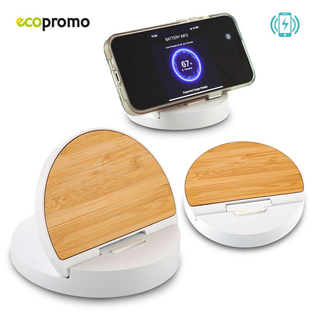 Cargador inalámbrico plástico de 10W con soporte para móviles y partes de bambú. Base antideslizante. Compatible con dispositivos equipados con tecnología de carga inalámbrica. Cable USB incluido. Empaque caja individual. Medidas: 1.7 cm x 9.5 cm diámetro Marca: 5 cm Láser