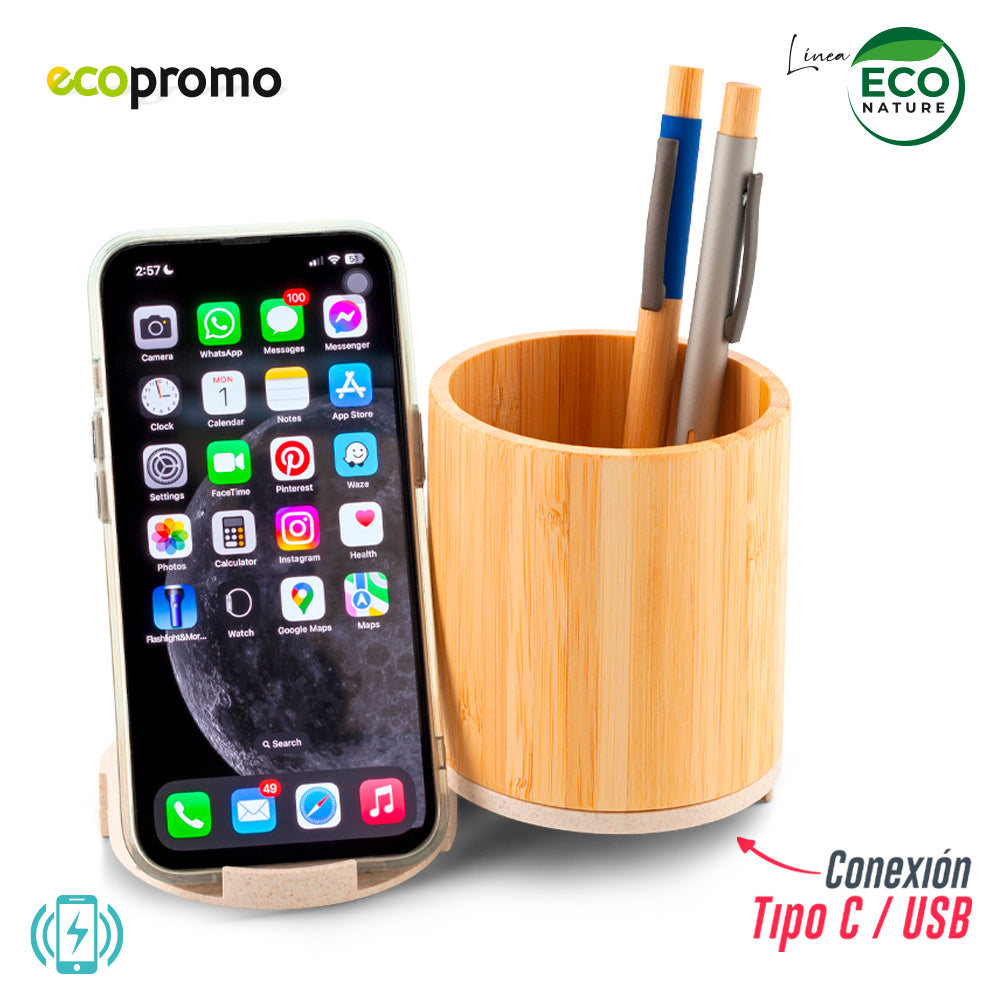 Cargador inalámbrico en fibra de trigo de 5W con portabolígrafos en bambú. Dos puertos USB y dos Tipo C. Incluye cable Tipo C para carga. Empaque caja individual.Lo que de saber: Este artículo transmite la energía y NO acumula carga para llevar, funciona siempre y cuando esté conectado. Sirve únicamente en dispositivos móviles que vengan desde fábrica con la funcionalidad de carga inalámbrica.Nota ImportanteLa tecnología de carga inalámbrica funciona con los dispositivos móviles compatibles con esta funcionalidad; se recomienda buscar en las especificaciones de su dispositivo móvil y en el manual de uso que puede descargarse para cada marca y modelo, si su dispositivo es compatible. Se recomienda retirar el forro protector de su móvil y cualquier otro elemento que genere interferencia cuando se coloque a cargar. Medidas: 10.8 cm x 8.5 cm. Marca: 4 cm Láser.