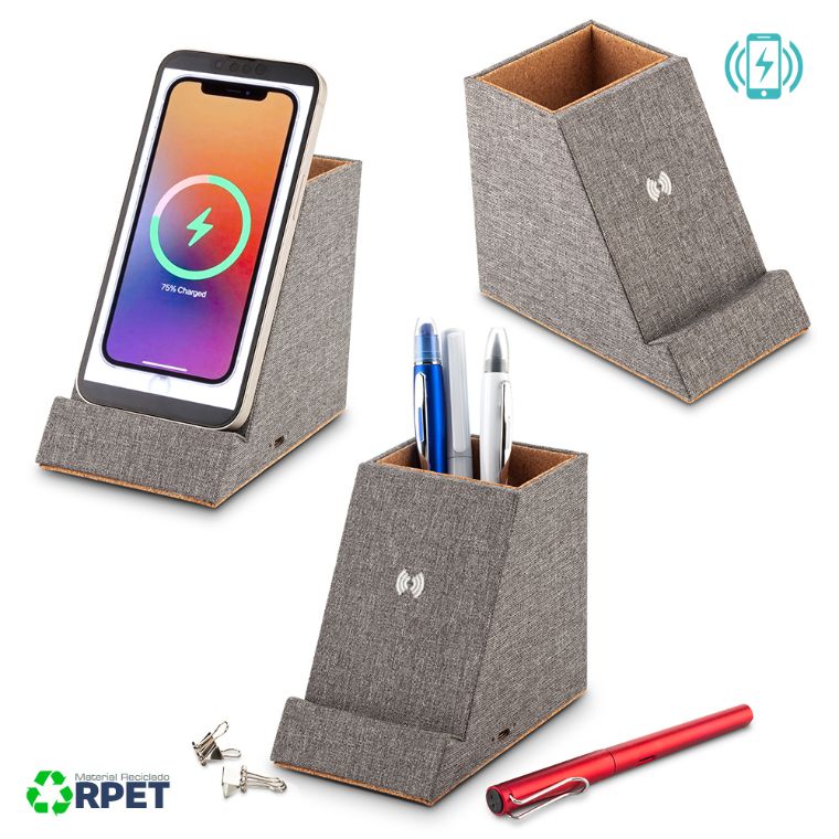 Cargador inalámbrico de 10W para móviles, con soporte para móviles y portalápices. En poliéster reciclado RPET y corcho. Compatible con dispositivos equipados con tecnología de carga inalámbrica. Cable USB incluido. Empaque caja individual. Medidas: 12.7 cm x 7.5 x 10.8 cm Marca: 4 cm Tampografía