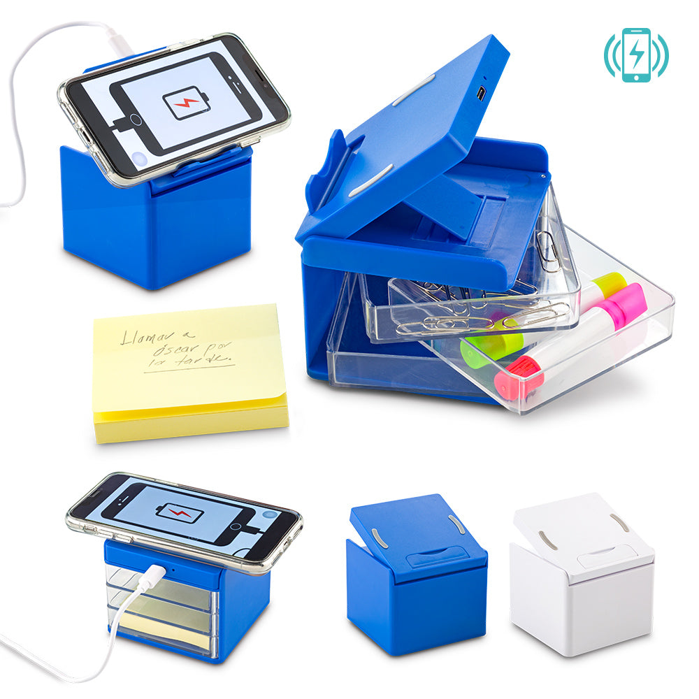 Cargador inalámbrico de 5W, con soporte para celular, tres mini compartimentos, taco de papel y clips. Empaque caja individual. Medidas Cerrado: 8.3 cm x 8.6 cm x 7 cm Marca: 5.5 cm Tampografía Lo que debe saber: Este artículo transmite la energía y NO acumula carga para llevar, funciona siempre y cuando esté conectado. Sirve únicamente en dispositivos móviles que vengan desde fábrica con la funcionalidad de carga inalámbrica. Nota Importante La tecnología de carga inalámbrica funciona con los dispositivos móviles compatibles con esta funcionalidad; se recomienda buscar en las especificaciones de su dispositivo móvil y en el manual de uso que puede descargarse para cada marca y modelo, si su dispositivo es compatible. Se recomienda retirar el forro protector de su móvil y cualquier otro elemento que genere interferencia cuando se coloque a cargar.