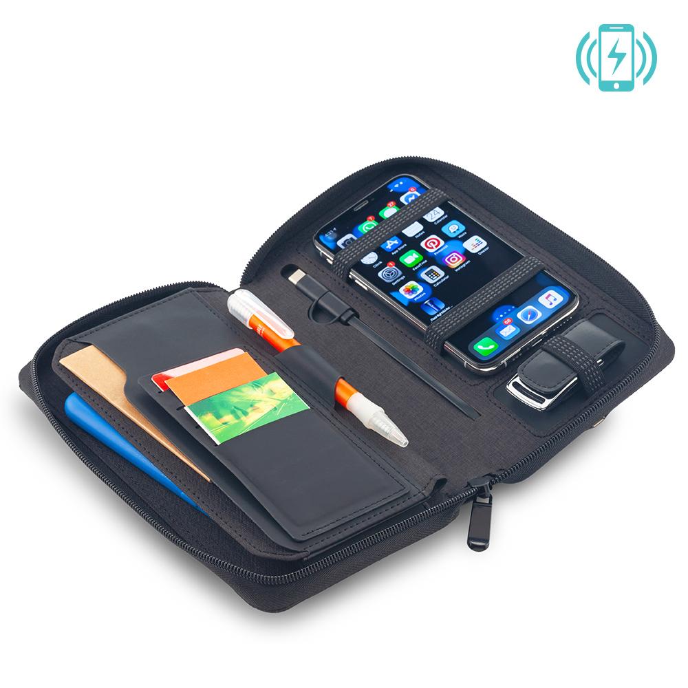 Portadocumentos en poliuretano con cierre de cremallera, cargador inalámbrico de 5W en la tapa superior, cable interno micro USB 2-1, pila incorporada de 4.000mAh. InputOutput cable: 5V 2A Output Wireless: 5V 1A. Empaque caja individual. Medidas: 21 cm x 13 cm x 2 cm Marca: 5 cm Screen Nota Importante La tecnología de carga inalámbrica funciona con los dispositivos móviles compatibles con esta funcionalidad; se recomienda buscar en las especificaciones de su dispositivo móvil y en el manual de uso que puede descargarse para cada marca y modelo, si su dispositivo es compatible. Se recomienda retirar el forro protector de su móvil y cualquier otro elemento que genere interferencia cuando se coloque a cargar. Ficha Técnica