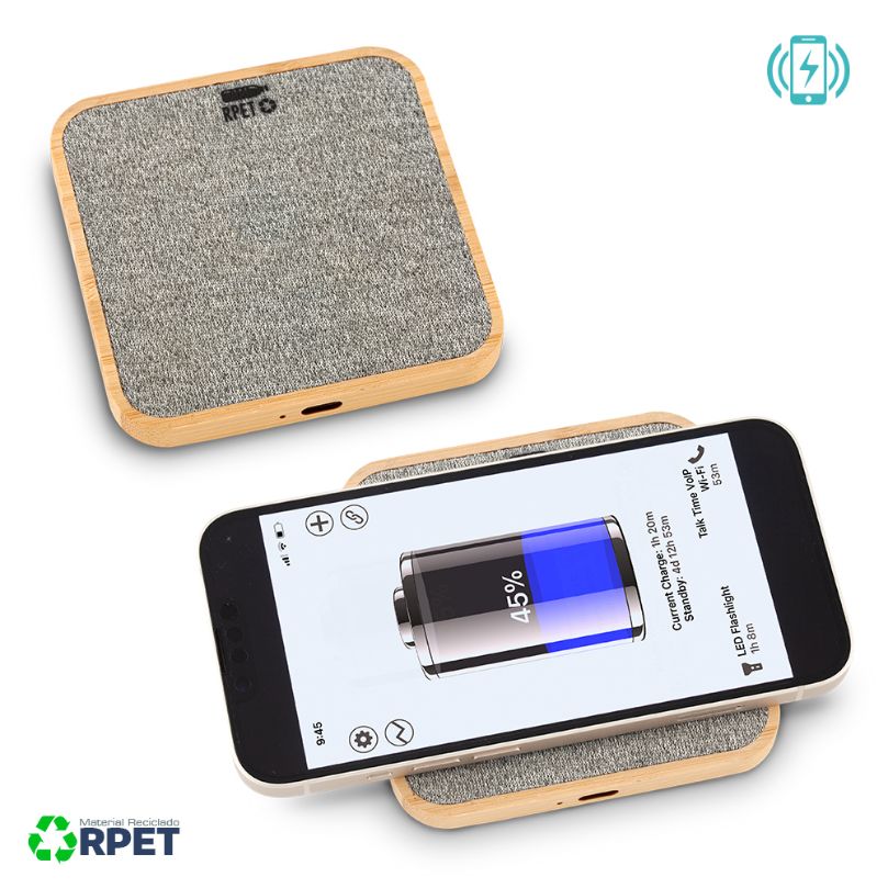Cargador inalámbrico de 15W en bambú y poliéster reciclado RPET. Compatible con dispositivos equipados con tecnología de carga inalámbrica. Empaque caja individual. Medidas: 9.3 cm x 9.3 cm Marca: 4.5 cm Tampografía