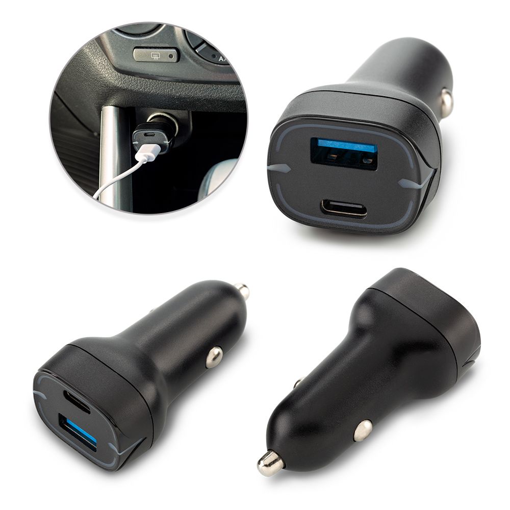 Cargador plástico dual para carro, con puertos USB y Tipo C. Empaque caja individual. Medidas: 6 cm x 3 cm x 2 cm Marca: 1.5 cm Tampografía