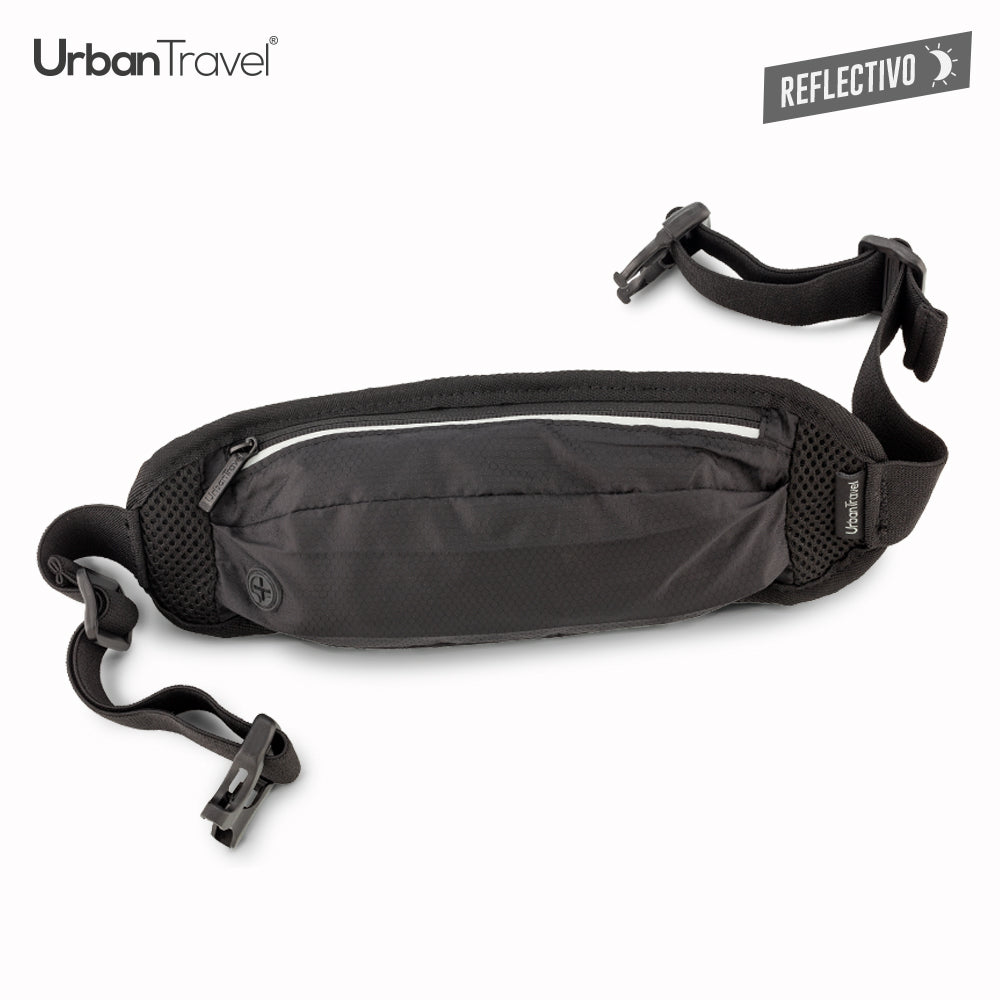 Canguro en poliéster impermeable. Dos bolsillos con cremallera uno externo y el otro interno, y salida para audífonos. Medidas: 32 cm x 10 cm. Marca: 10 cm Screen.