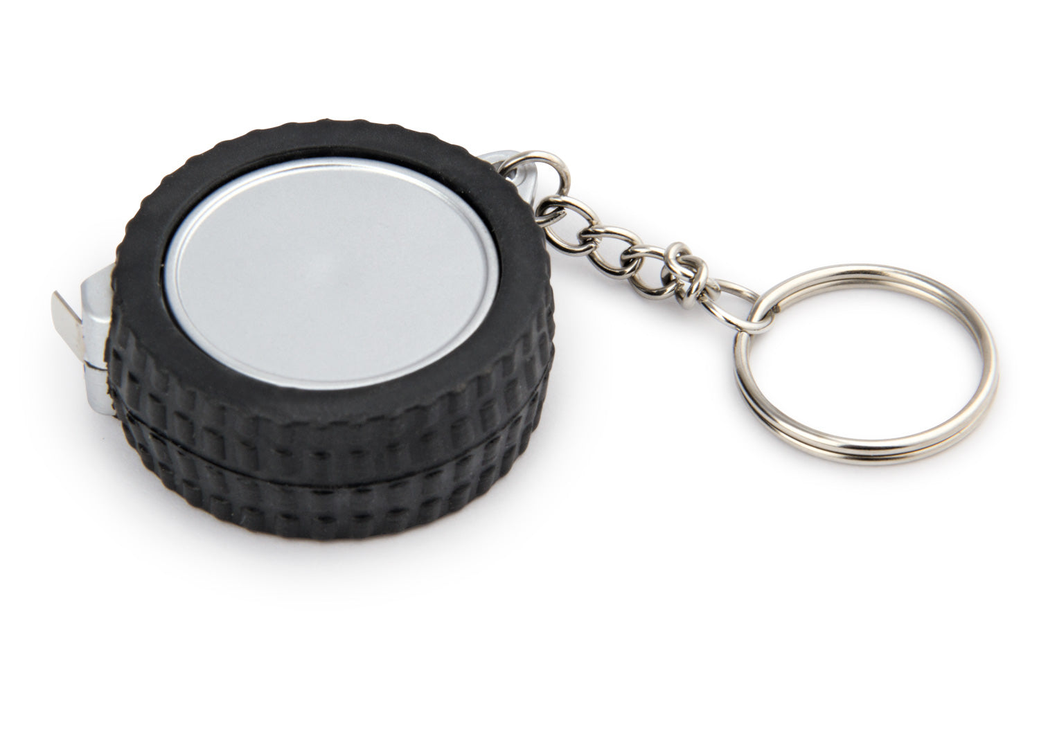 Llavero con cubierta con forma de llanta. Con cinta métrica metálica de 1m39 pulgadas. Con argolla para llavero.. Area impresion: 2 x 1,5 cm. . Medidas Largo: 1.60