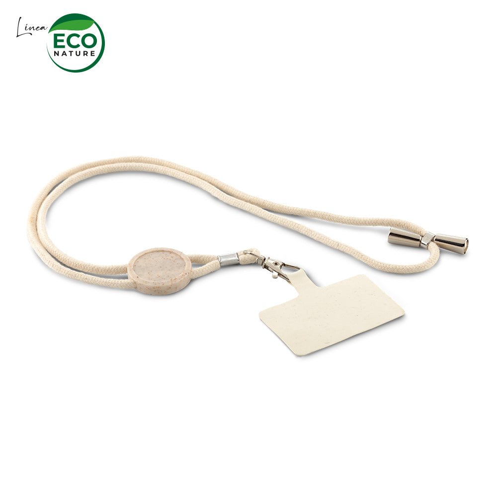 Cinta portacarnet en algodón con gancho metálico y partes en plástico ecológico de fibra de trigo. Con tarjeta para insertar en forro del móvil. Medidas: 59 cm x 3.5 cm Marca: 1.5 cm Tampografía Ficha Técnica