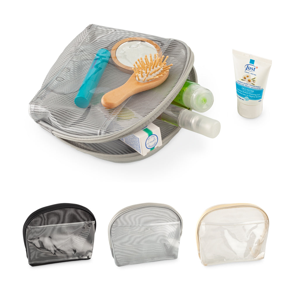 Cosmetiquera en poliéster con un bolsillo externo en PVC. Medidas: 19 cm x 17 cm x 9 cm. Marca: 8 cm Screen Tampografía. Ficha Técnica