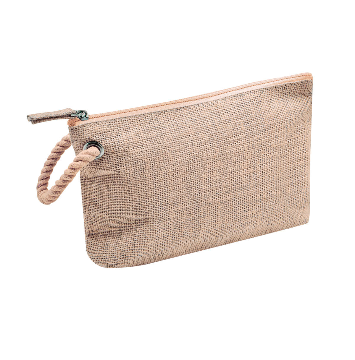 Cosmetiquera con fuelle. Compartimento principal con cierre. Incluye asa de algodón. El yute es un producto natural el cual puede presentar variaciones en tonalidades y en la urdimbre y trama de la tela.. Medidas: 23 x 13.5 x 4 cm . Material: Yute / Algodón