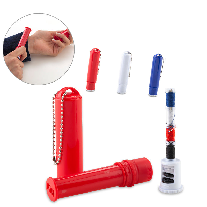Costurero plastico con quitamotas tipo adhesivo reutilizable. Medidas: 9.7 cm x 2.6 diametro Marca: 3.5 cm  Tampografia
