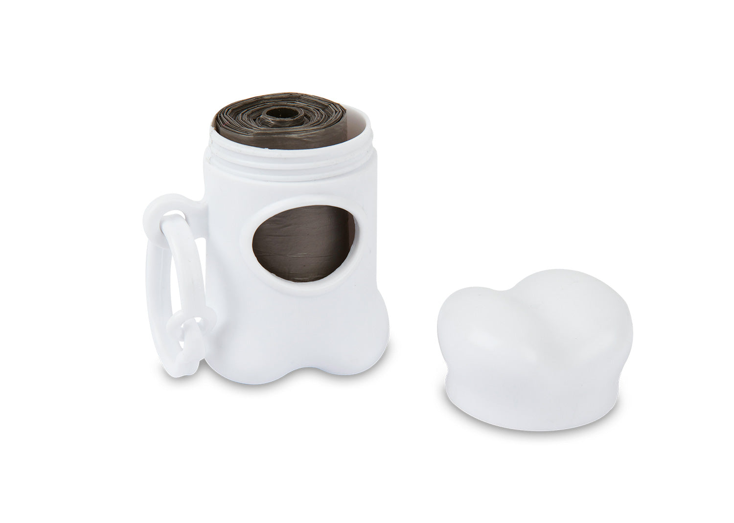 Dispensador de bolsas para mascota con forma de hueso. Con gancho y bolsas incluidas. Espesor por pieza de bolsa: 0.007 milímetros.. Area impresion: 2,5 x 1,4 cm. . Medidas Largo: 3.50 . Medidas Ancho: 8.00 . Medidas Alto: 5.50