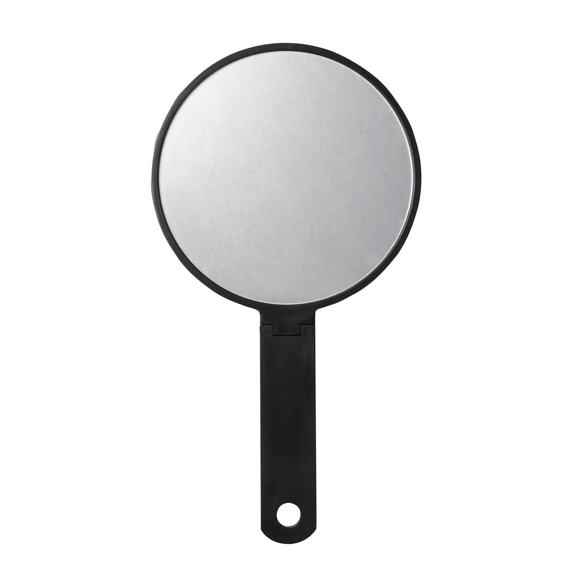 Espejo circular de mano con asa plegable. Su asa multifuncional se convierte en soporte y tiene un orificio para colgarlo fácilmente donde lo requieras.. Medidas: 12 x 22 cm . Material: Plástico