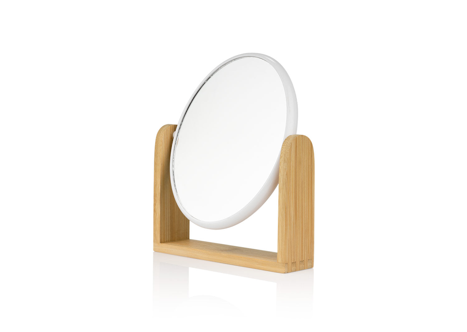 Espejo de tocador de doble cara, uno de ellos con aumento de 2X, puede girar sobre su eje hasta 360 grados. Base de madera.. Area impresion: Tampo: 7 cm x 2,5 cm Láser: 4 cm x 1,5 cm . Medidas Largo: 4.4 . Medidas Ancho: 17.2 . Medidas Alto: 20.6