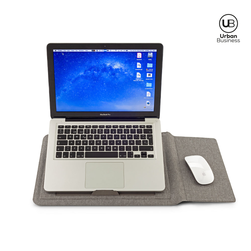 Soporte multiusos para trabajo en poliéster reciclado RPET. Tiene un soporte plegable el cuál se ajusta máximo a computadores de 16, la solapa funciona cómo mouse pad y tiene un compartimiento para documentos. Empaque caja individual. Medidas: 39.5 cm x 28.9 cm. Marca: 12 cm Screen.