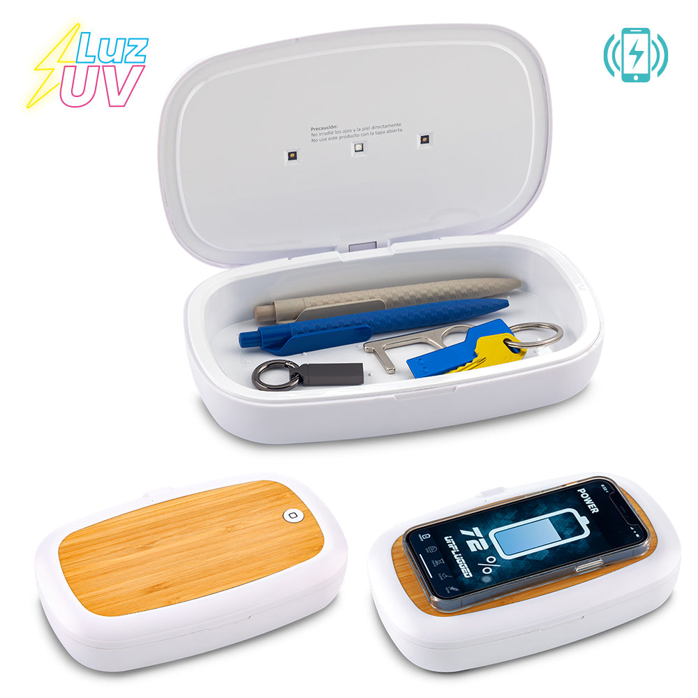 Producto multifuncional de alta tecnología, apto para teléfonos celulares de 4.7 a 6 pulgadas. Al mismo tiempo, también es adecuado para una variedad de productos como auriculares Bluetooth, tapones para los oídos, relojes inteligentes, dispositivos electrónicos etc. Capacidad interna 18cm x 10.5cm x 2.5cm. Es un producto que consume poca energía y ambientalmente amigable. La luz UV LED solo funciona con el dispositivo completamente cerrado. La función de carga inalámbrica se realiza colocando el smartphone sobre la tapa de bambú del esterilizador. Empaque caja individual. Medidas: 20.5 cm x 12.5 cm x 4 cm Marca: 4.5 cm Láser Lo que debe saber: Este artículo transmite la energía y NO acumula carga para llevar, la carga inalámbrica funciona siempre y cuando esté conectado. Sirve únicamente en dispositivos móviles que vengan desde fábrica con la funcionalidad de carga inalámbrica. Nota Importante: La tecnología de carga inalámbrica funciona con los dispositivos móviles compatibles con esta funcionalidad; se recomienda buscar en las especificaciones de su dispositivo móvil y en el manual de uso que puede descargarse para cada marca y modelo, si su dispositivo es compatible. Se recomienda retirar el forro protector de su móvil y cualquier otro elemento que genere interferencia cuando se coloque a cargar. Ficha Técnica
