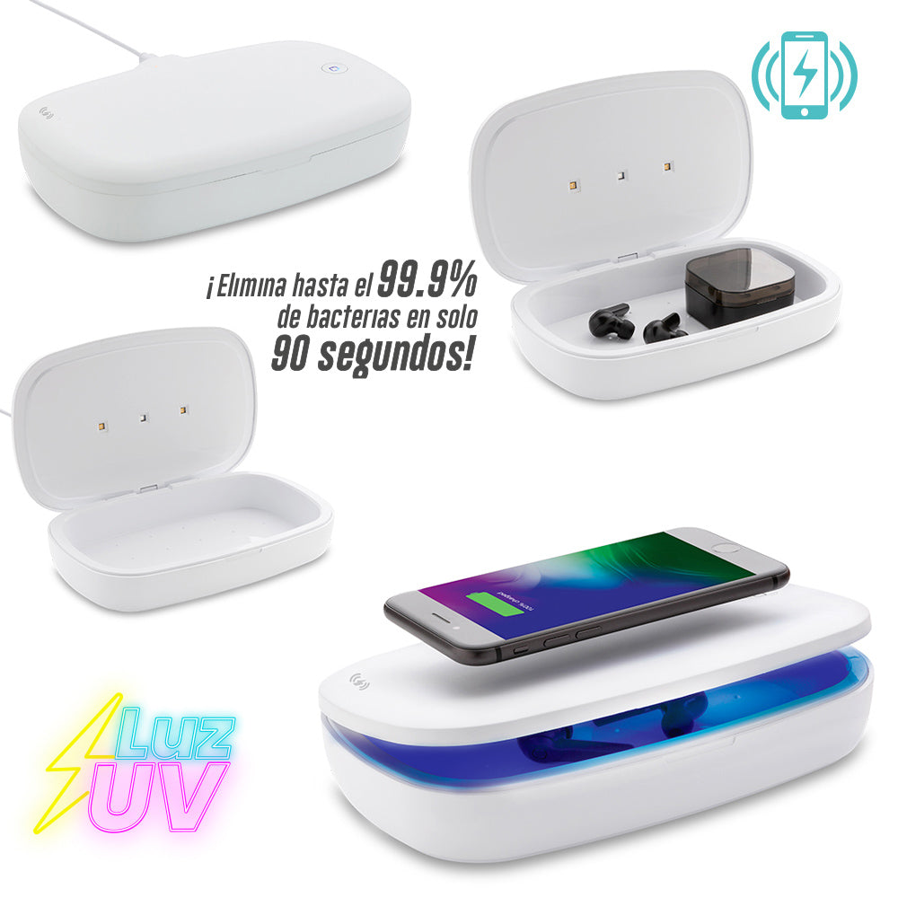Producto multifuncional de alta tecnología, apto para teléfonos celulares de 4.7 a 6 pulgadas. Al mismo tiempo, también es adecuado para una variedad de productos como auriculares Bluetooth, tapones para los oídos, relojes inteligentes, dispositivos electrónicos etc. Capacidad interna 18cm x 10.5cm x 2.5cm. Es un producto que consume poca energía y ambientalmente amigable. La luz UV LED solo funciona con el dispositivo completamente cerrado. La función de carga inalámbrica se realiza colocando el smartphone sobre la tapa del esterilizador. Medidas: 20 cm x 11.5 cm x 4 cm  Marca: 5 cm Tampografía con Empaque y Desempaque Lo que debe saber: Este artículo transmite la energía y NO acumula carga para llevar, la carga inalámbrica funciona siempre y cuando esté conectado. Sirve únicamente en dispositivos móviles que vengan desde fábrica con la funcionalidad de carga inalámbrica. Nota Importante La tecnología de carga inalámbrica funciona con los dispositivos móviles compatibles con esta funcionalidad; se recomienda buscar en las especificaciones de su dispositivo móvil y en el manual de uso que puede descargarse para cada marca y modelo, si su dispositivo es compatible. Se recomienda retirar el forro protector de su móvil y cualquier otro elemento que genere interferencia cuando se coloque a cargar. VIDEO Ficha Técnica