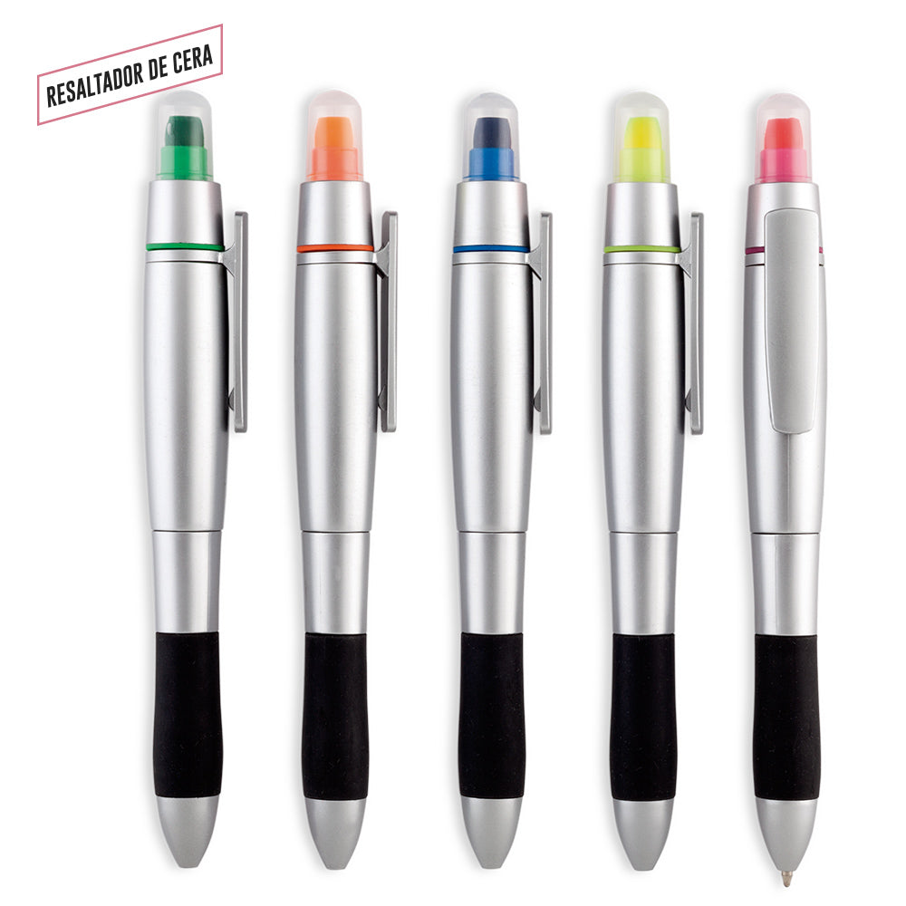 Bolígrafo plástico con resaltador de cera. No se seca. Medidas: 15 cm Marca: 3.5 cm Tampografía Venta mínima y en múltiplos de caja de 50 unidades por color.    Ficha Técnica