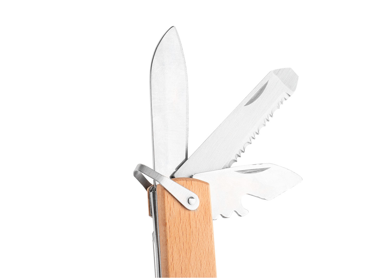 Esta herramienta multifunción cuenta con un diseño compacto y mango de madera, e integra funciones esenciales como martillo, apilador, extractor de clavos 7,2 X 13,8, dos destornilladores pala y estrella, cuchillo 1,7 X 18,1, abrebotellas 2 X 16,2 y una lima de uñas con cuchillo de sierra 1,7 X 18,7. Su formato plegable permite un fácil almacenamiento y transporte, ideal para tareas básicas en distintos entornos.. Area impresion: Láser: (5 X 1). . Medidas Largo: 0.5 . Medidas Ancho: 6.7 . Medidas Alto: 15.7