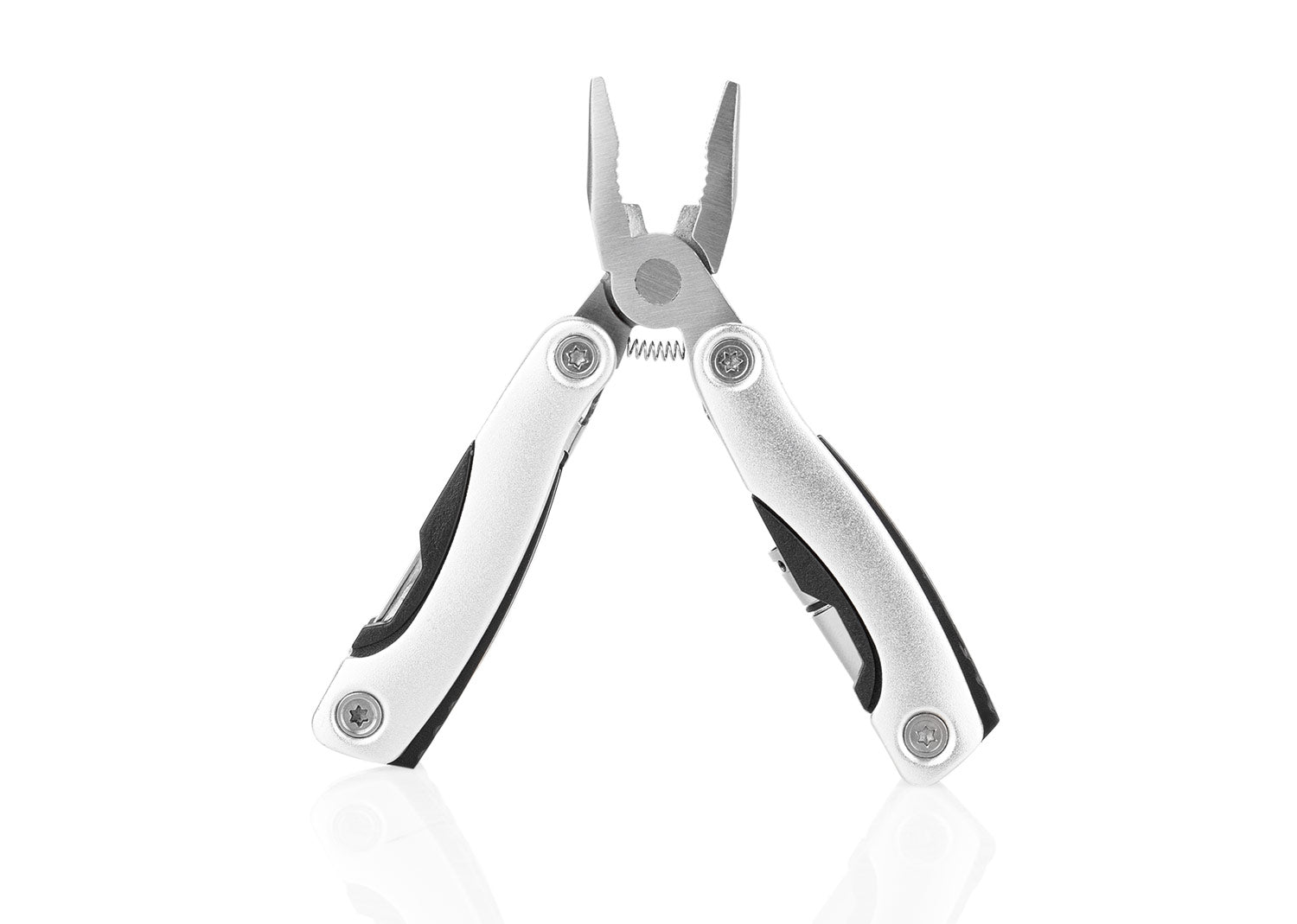 Herramientero metálico con estuche. Incluye alicate, linterna con luz LED, destornillador de estrella, pala, navaja y sierra. Estuche con cierre en velcro.. Area impresion: Screen: 2 x 3 cm. Láser: 0,5 x 2 cm. . Medidas Largo: 1.5 . Medidas Ancho: 3 . Medidas Alto: 7