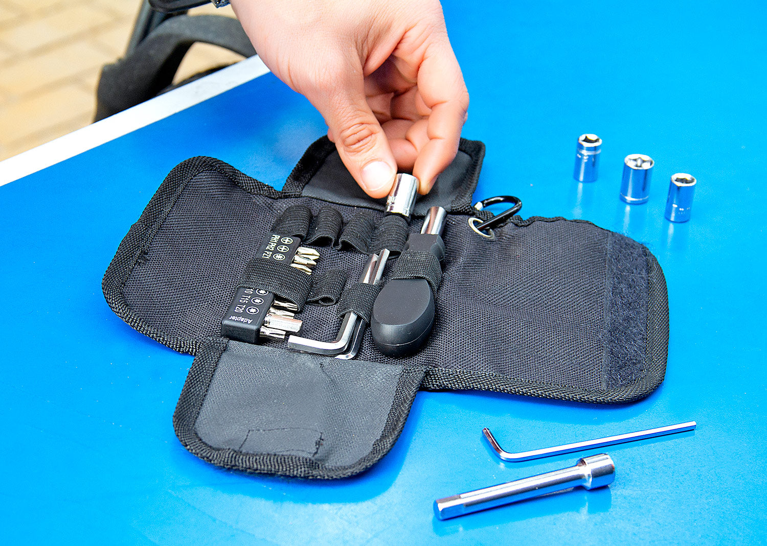 Set de herramientas presentado en estuche textil tipo sobre con cierres en velcro, carabinero y sujetadores elasticos al interior; incluye: Mango con adaptador, 9 puntas, 1 adaptador para copas, 1 extensor, 4 copas y 3 llaves hexagonales.. Area impresion: Screen: 7 cm de ancho . Medidas Largo: 2.00 . Medidas Ancho: 9.00 . Medidas Alto: 14.00