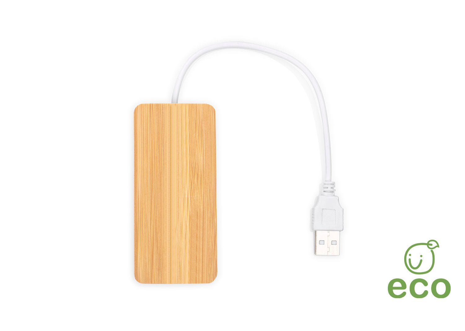 HUB de 3 puertos compatible con cualquier dispositivo con entrada USB, interfaz 2.0. Diseño en Bambú. Area impresion: Láser: 5x2 cm - Tampo: 5 cm . Medidas Largo: 8.60 . Medidas Ancho: 4.00 . Medidas Alto: 1.60