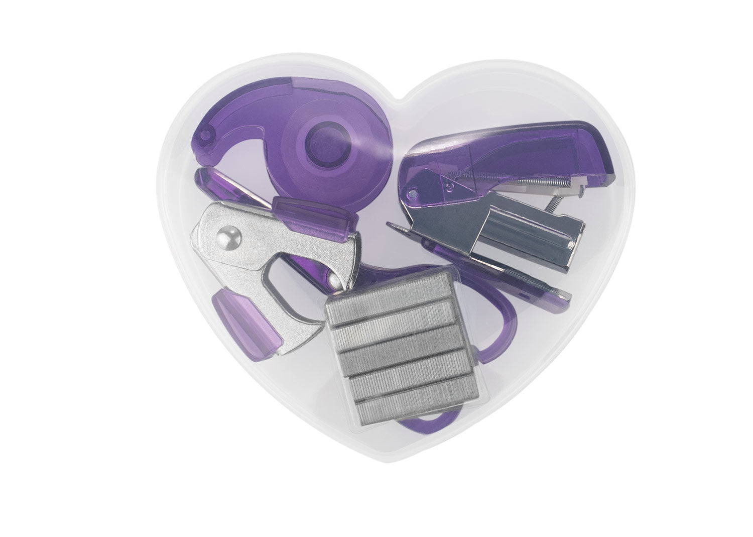 Práctico set de oficina presentado en un estuche con forma de corazón elaborado en material PP. Incluye grapadora 4,1 X 3,1 X 1,8, dispensador de cinta transparente 4 X 2,3 X 1,4, tijeras pequeñas 7,1 X 3,3, quitagrapas 3,3 X 3,3 X 1,7 y 500 grapas, ofreciendo todo lo necesario para tareas básicas de organización. Su diseño compacto y colorido lo convierte en una solución funcional y fácil de transportar para el hogar, la oficina o el estudio.. Area impresion: Tampo: (4,5 X 4). . Medidas Largo: 2.8 . Medidas Ancho: 9.2 . Medidas Alto: 8